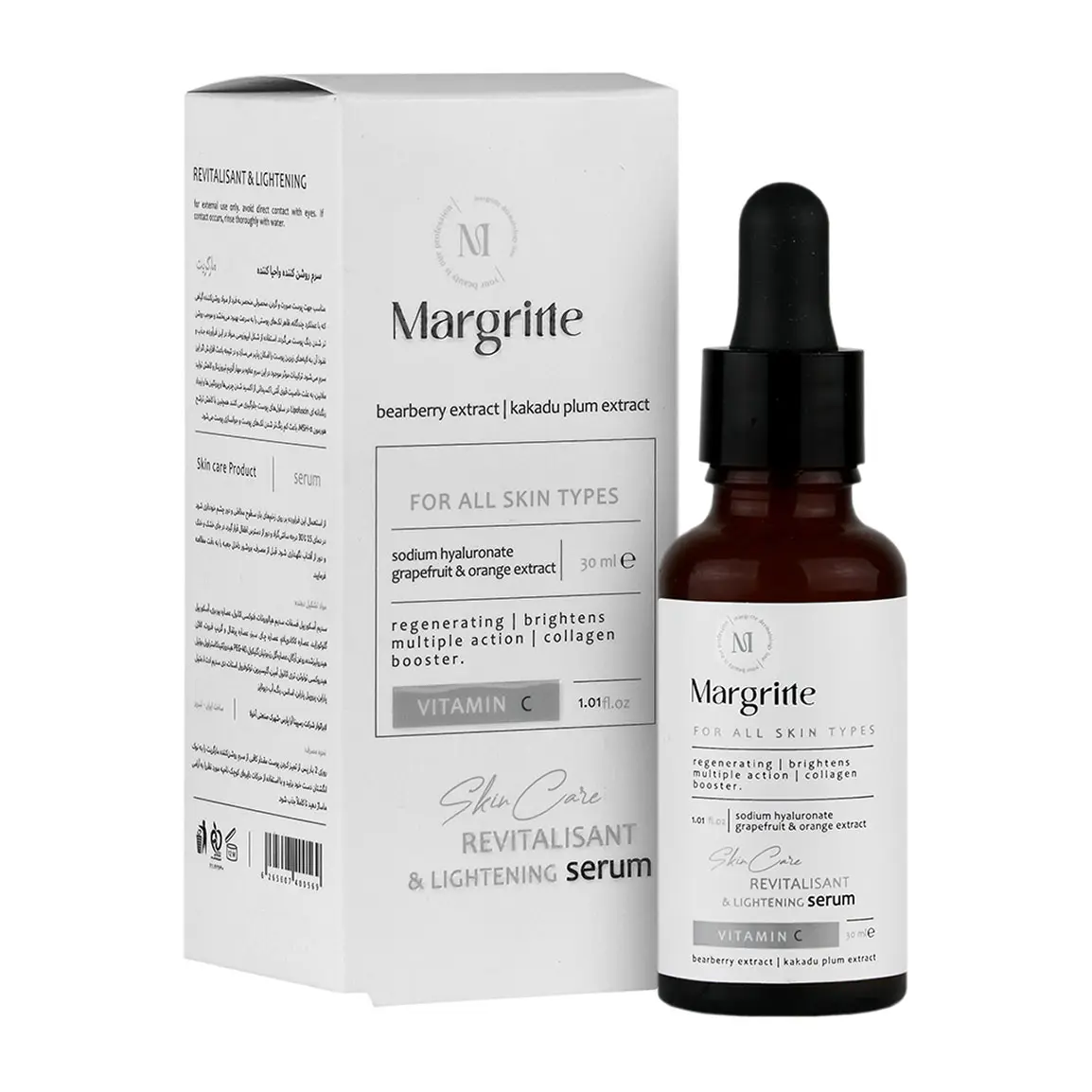 فرمولاسیون هوشمندانه سرم مارگریت با بهره گیری از ویتامین C پایدار و نیاسینامید (ویتامین B3)،به طور موثری به کاهش لک های تیره و یکدست شدن رنگ پوست کمک می کند . این ترکیبات قدرتمند به مهار تولید ملانین اضافی و تقویت سلول های پوستی می پردازند و در نتیجه، پوست شما روشن تر و شاداب تر به نظر می رسد. این سرم روشن کننده و احیا کننده به شما کمک می کند تا با کدری و خستگی پوست خداحافظی کنید.