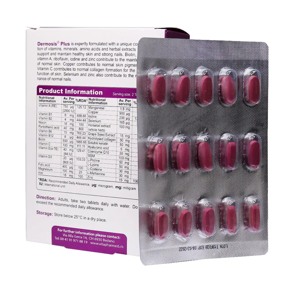 قرص Dermosis Plus بسته 60 عددی، مکملی تخصصی و کارآمد است که با فرمولاسیون پیشرفته ی خود، به طور همزمان به تقویت و بهبود وضعیت پوست، مو و ناخن ها می پردازد. این محصول با هدف تغذیه از درون، به رفع نیازهای ضروری بدن برای حفظ شادابی و جوانی کمک کرده و با رویکردی جامع، درخشش و استحکام را به شما بازمی گرداند.